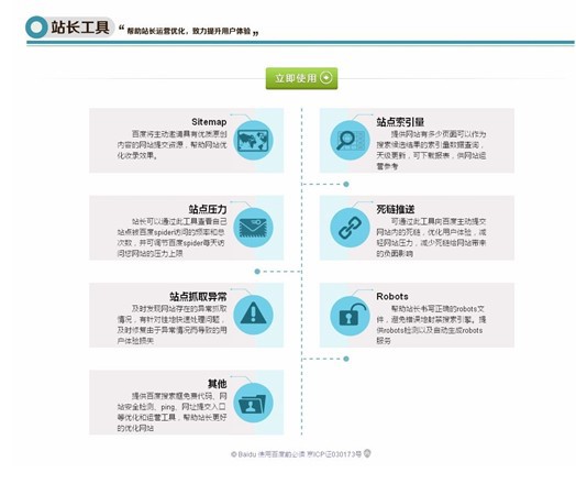 站長(zhǎng)可以通過工具區(qū)提供的死鏈推送、站點(diǎn)索引量查詢、站點(diǎn)抓取報(bào)錯(cuò)查詢、robots工具、站點(diǎn)壓力反饋和網(wǎng)站安全監(jiān)測(cè)等功能,減輕網(wǎng)站服務(wù)器壓力,提升網(wǎng)頁(yè)抓取效率和質(zhì)量,減少網(wǎng)站安全隱患,從而實(shí)現(xiàn)網(wǎng)站的精細(xì)化運(yùn)營(yíng)。資料區(qū)提供了搜索優(yōu)化案例、工具使用說(shuō)明、網(wǎng)站運(yùn)營(yíng)經(jīng)驗(yàn)文檔,幫助站長(zhǎng)汲取網(wǎng)站運(yùn)營(yíng)經(jīng)驗(yàn)、夯實(shí)理論基礎(chǔ);站長(zhǎng)社區(qū)的則是站長(zhǎng)間溝通和分享的平臺(tái),既會(huì)定期組織交流活動(dòng)和分享討論,,有利于站長(zhǎng)們?nèi)¢L(zhǎng)補(bǔ)短提升網(wǎng)站運(yùn)作技巧,解決站長(zhǎng)面臨的典型問題。